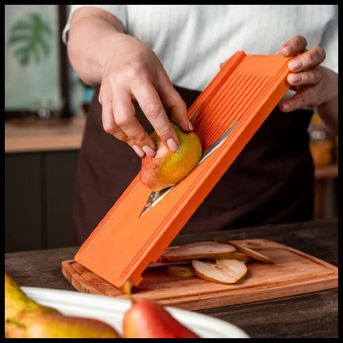 حطي الفاكهة أو الخضار في الحامل الآمن اختاري السماكة المطلوبة للشرائح ومرري الحامل فوق الشفرة بحركة ثابتة. اجمعي الشرائح واستخدميها في طهيك.